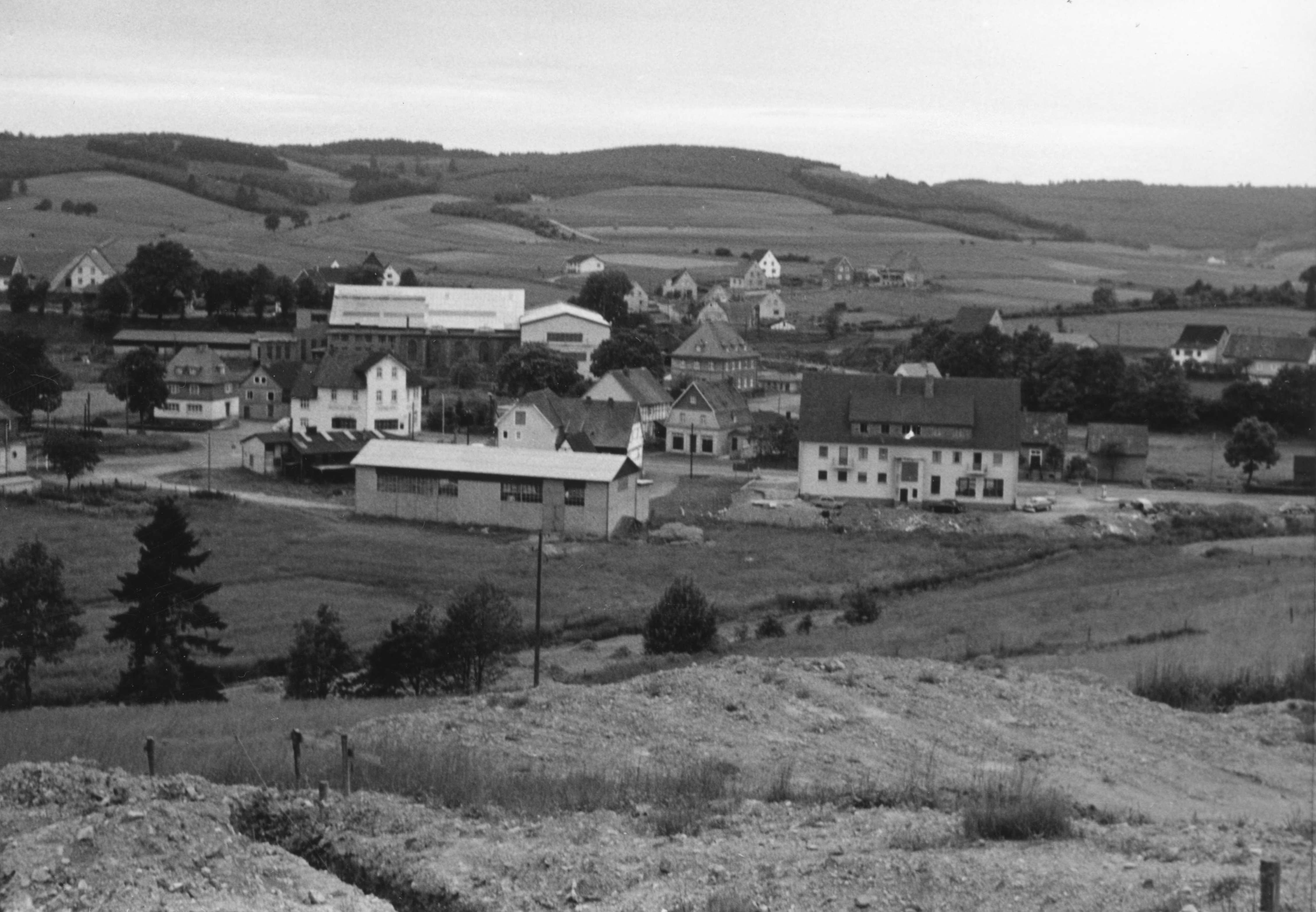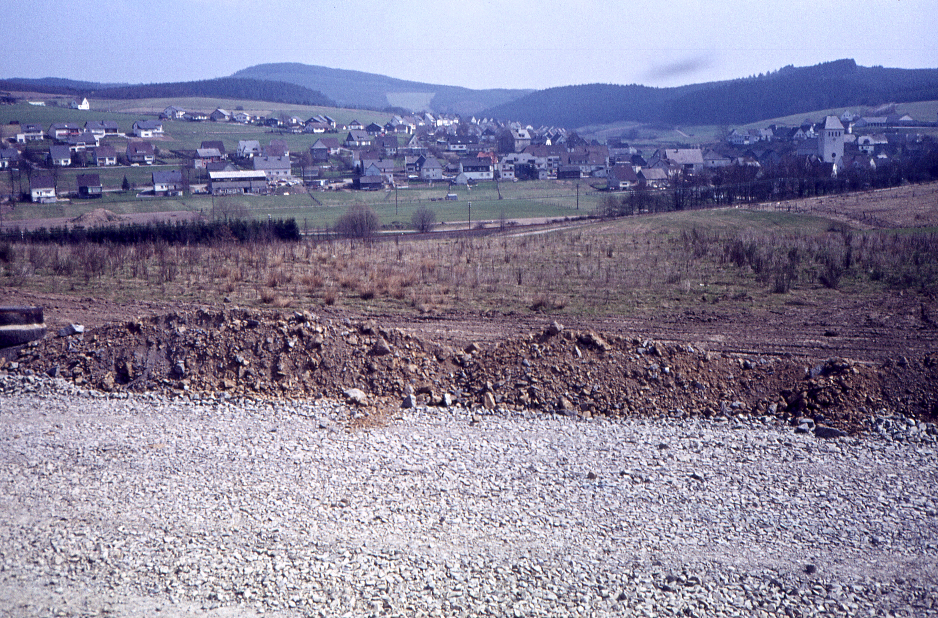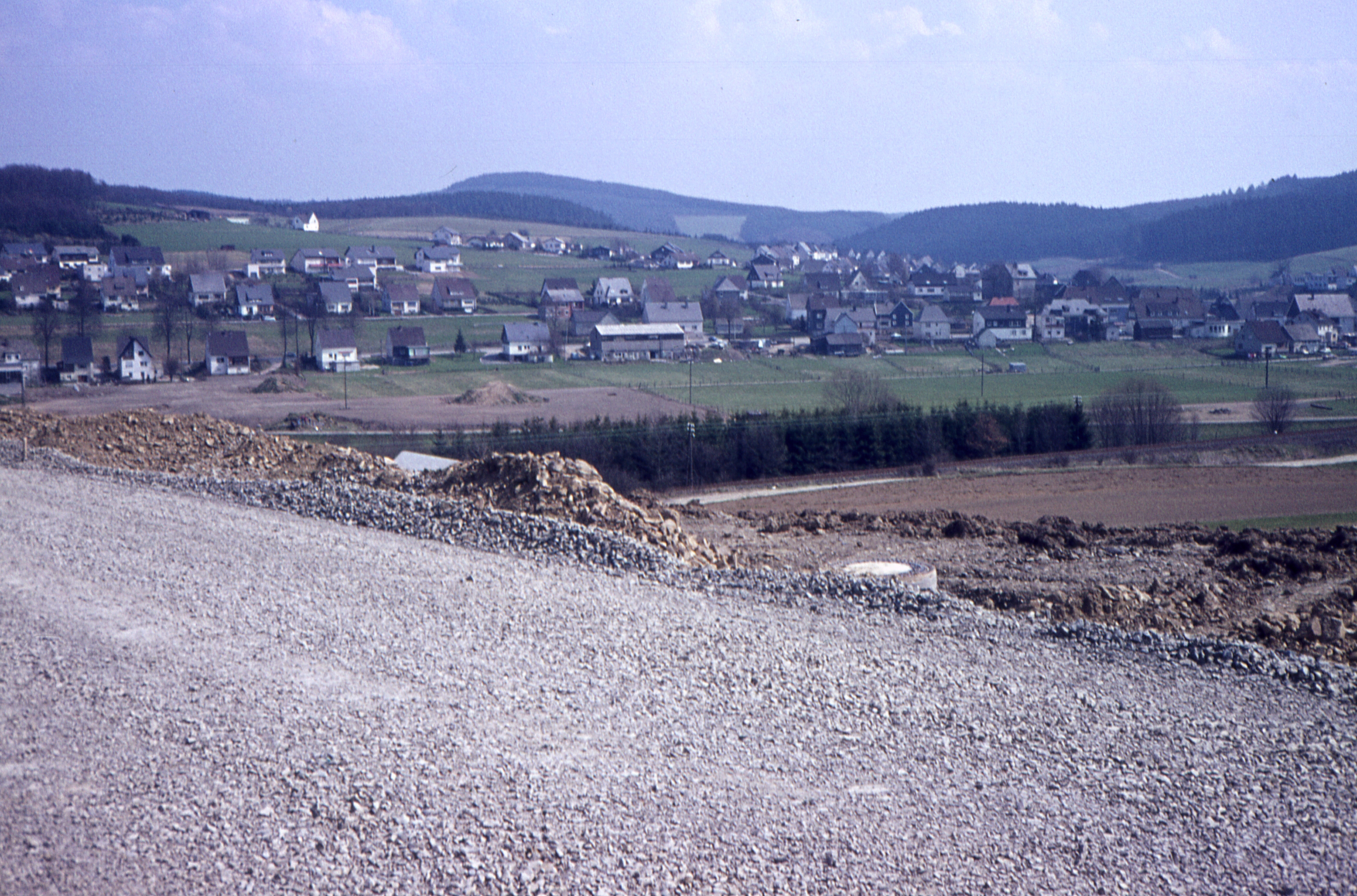 Wörmicke 1962; hier verläuft heute die Autobahn A45; das erste Haus vorne (von Johannes Zimmermann) und die beiden Häuser weiter rechts hinten wurden 1968 wegen der A45 abgerissen