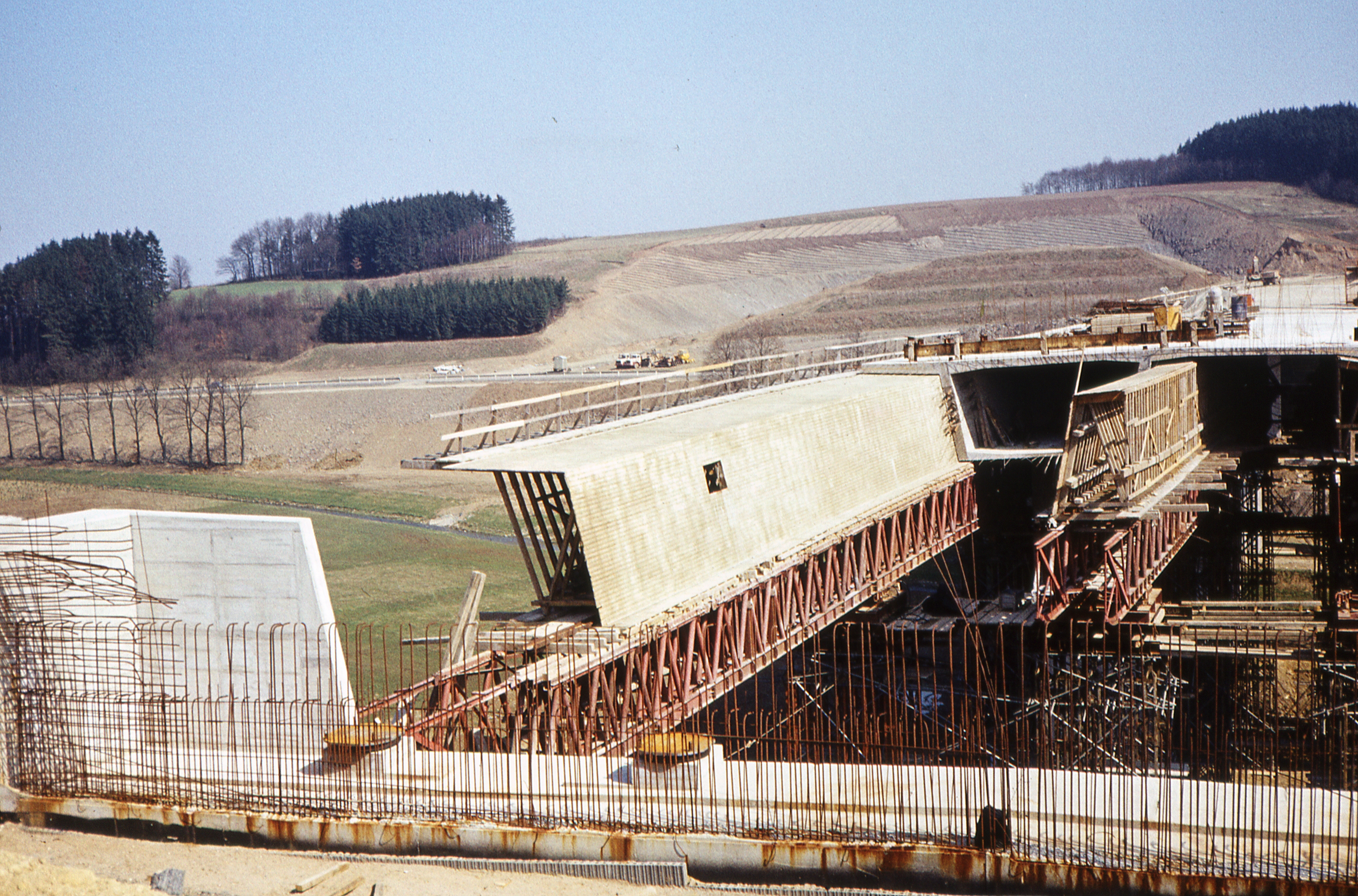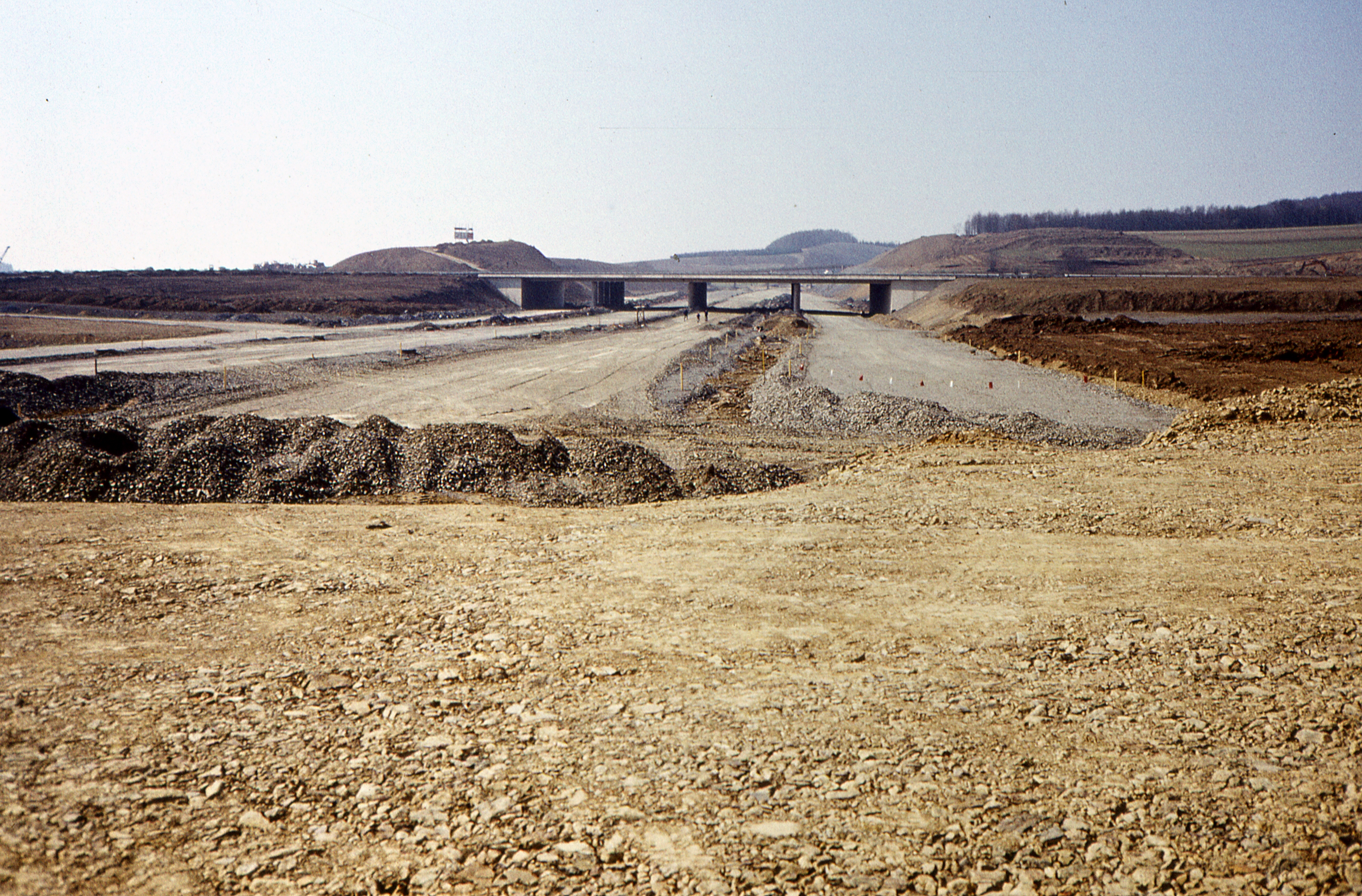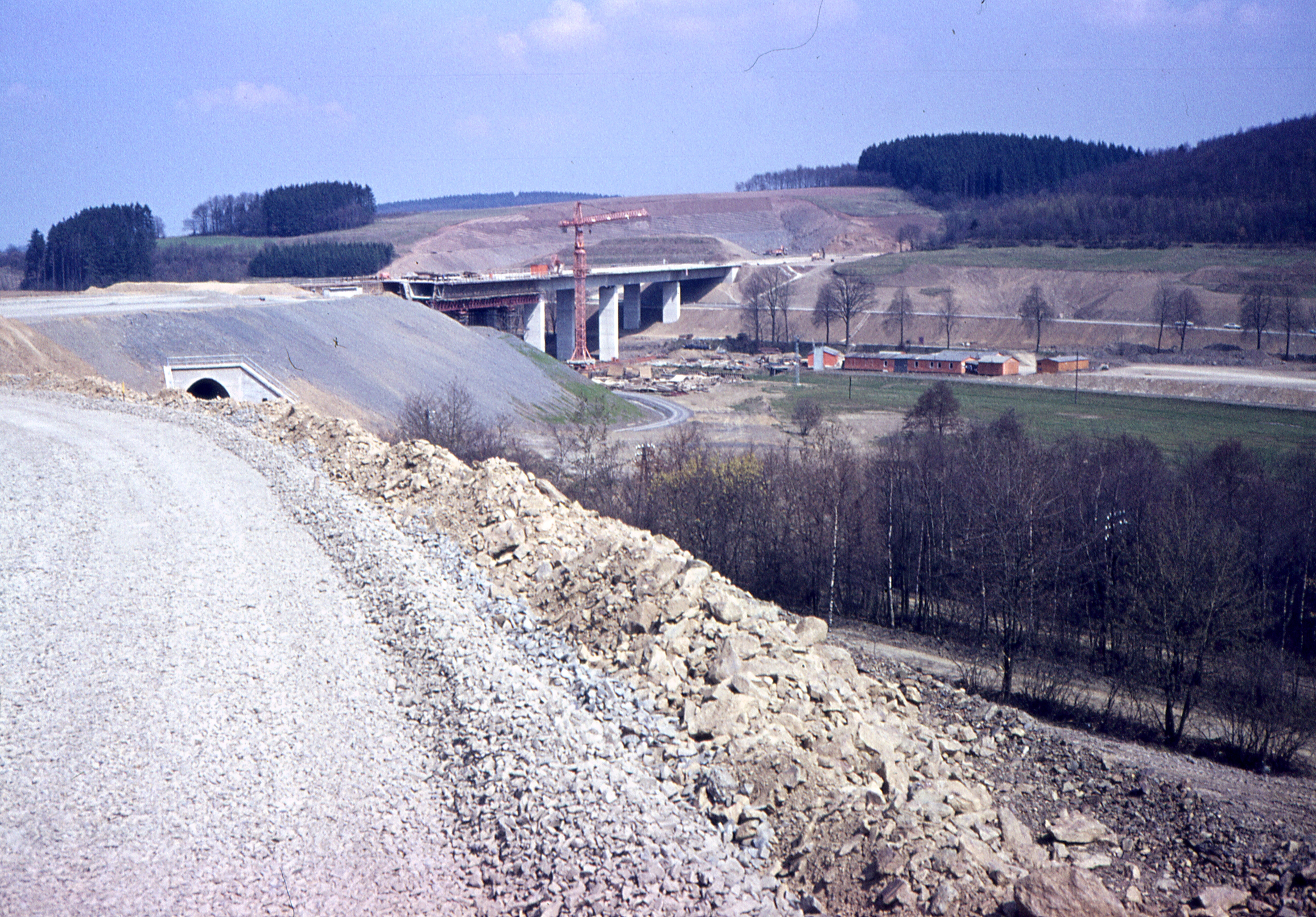 Blick auf die Talbrücke der A45 in Gerlingen Mitte 1970er; Standort ist das Gewerbegebiet von Dahl;