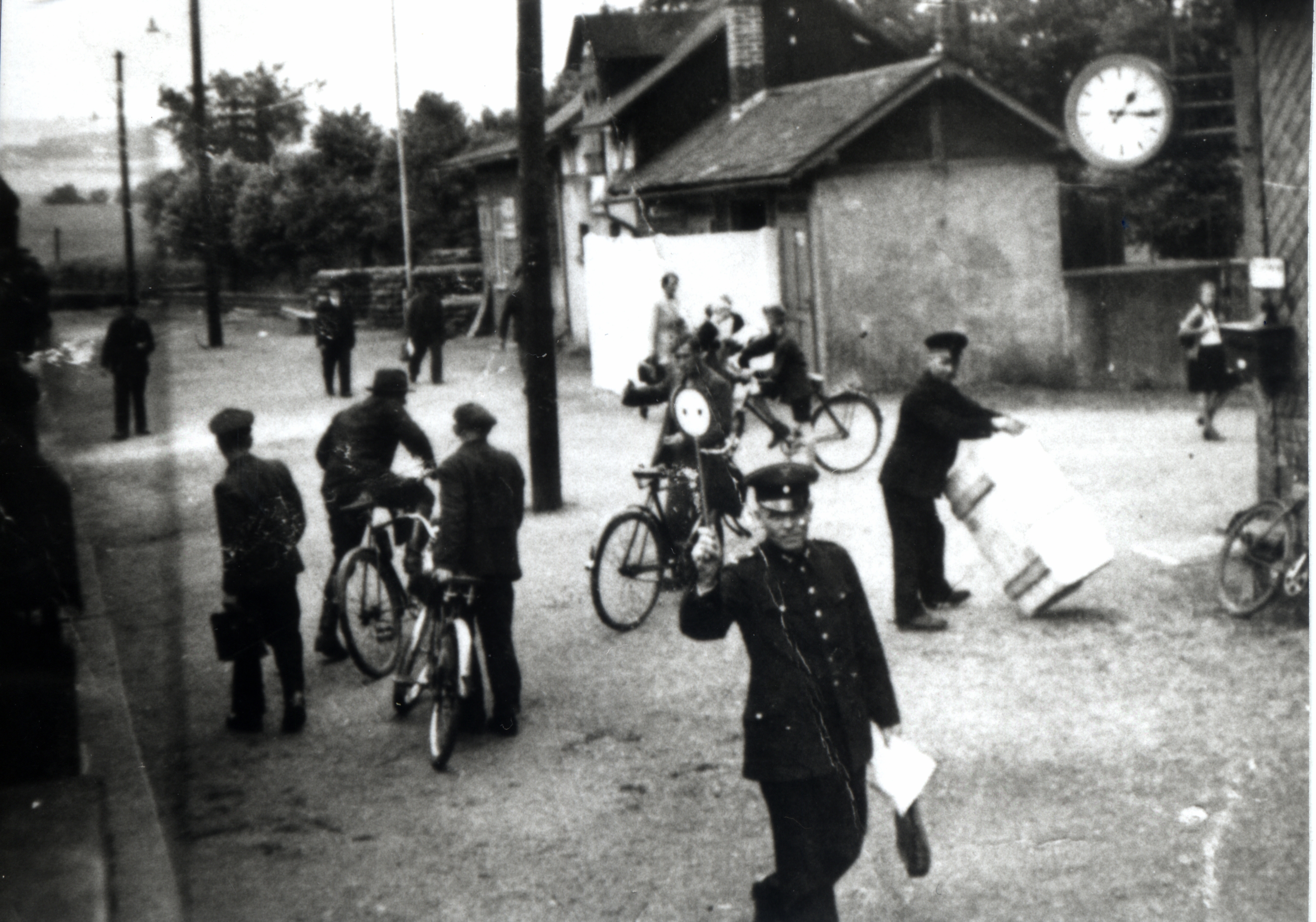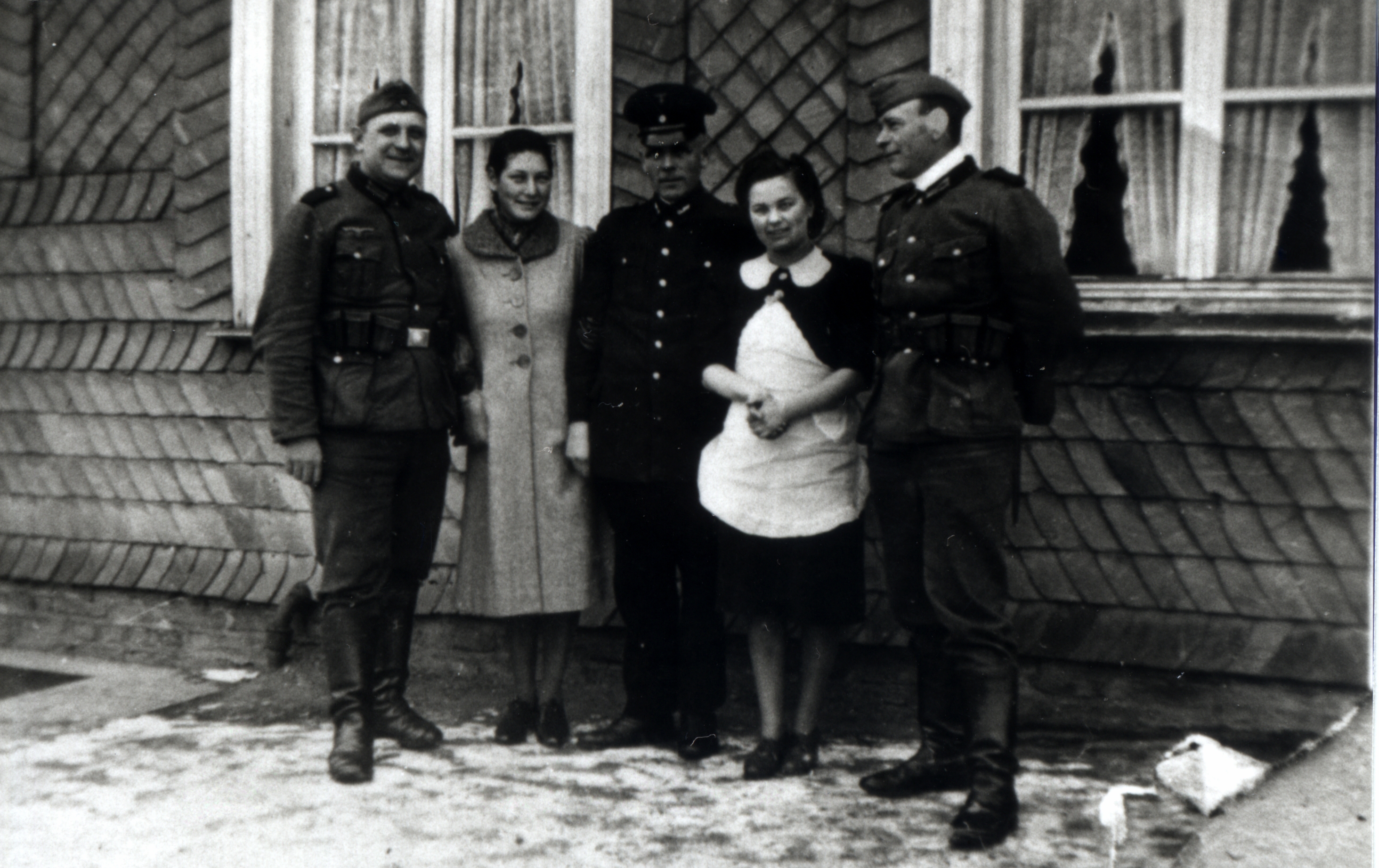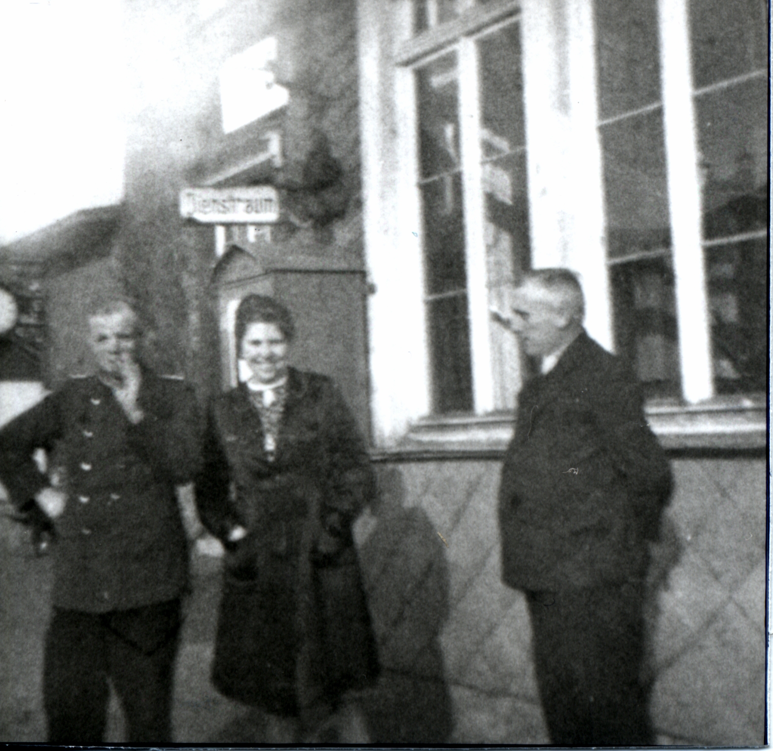 Johann Zimmermann (Bahnhofsvorsteher -Mitte) und zwei Wachsoldaten des Kriegsgefangenenlagers 1943